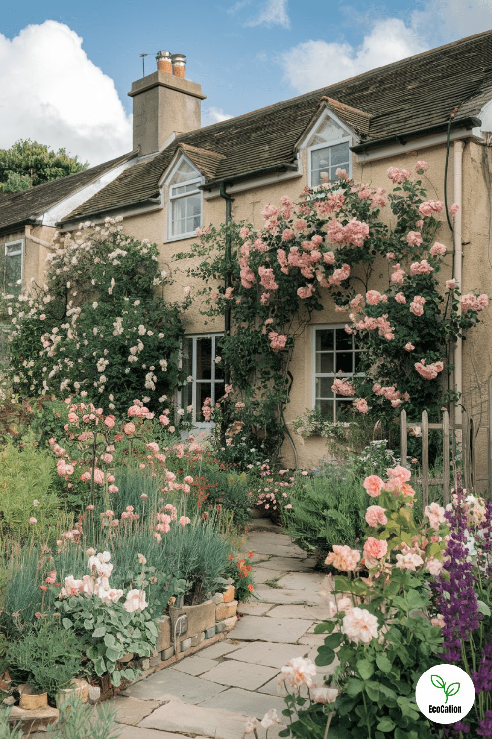 Create a picturesque cottage garden with overflowing flower beds, climbing roses, and a quaint stone pathway. These sun-loving plants like daisies, lavender, and hollyhocks thrive in full sunlight, offering color and fragrance. The stone pathway adds a rustic touch, making this charming garden perfect for sunny front yards.