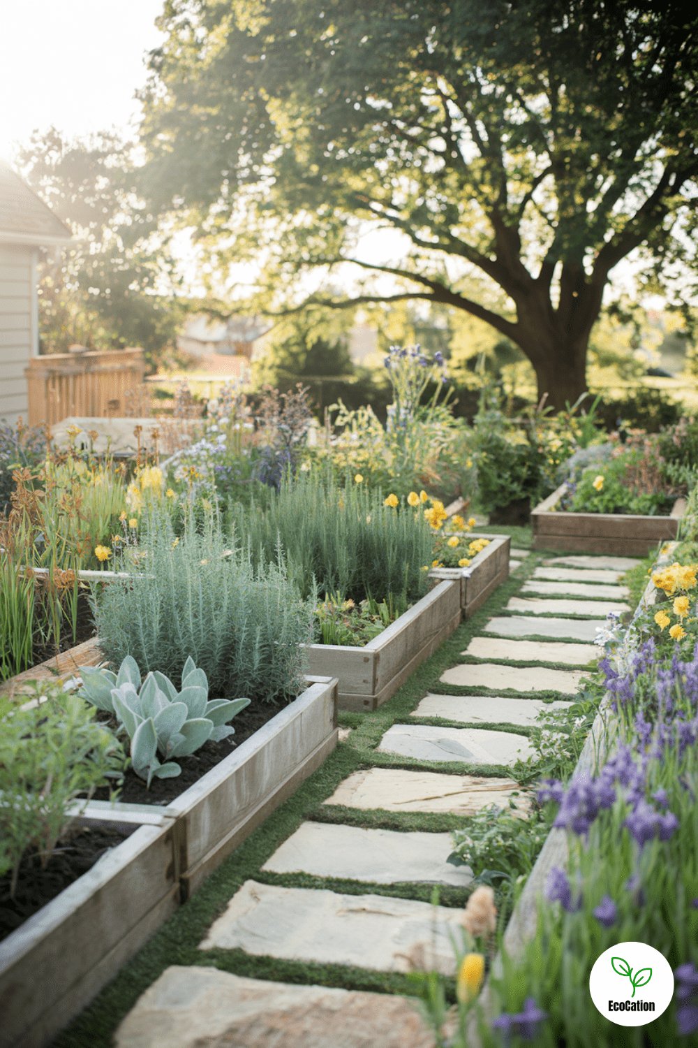 A delightful front yard featuring raised beds of rosemary, thyme, and sage mixed with colorful flowers and rustic stone pathways basks in full sunlight. This functional garden not only provides fragrant herbs for your kitchen but also adds beauty and structure to your landscape. The combination of herbs and flowers creates a harmonious, sun-loving space perfect for full sun exposure.