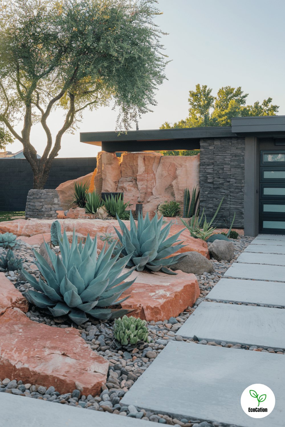 A sleek, modern front yard with agave plants, aloe, and decorative rock formations exudes contemporary charm. These sun-loving plants have a striking appearance and thrive with minimal water. Consider using large agave plants as focal points, surrounded by a minimalist landscape of smooth gravel or stones for a clean, architectural look.