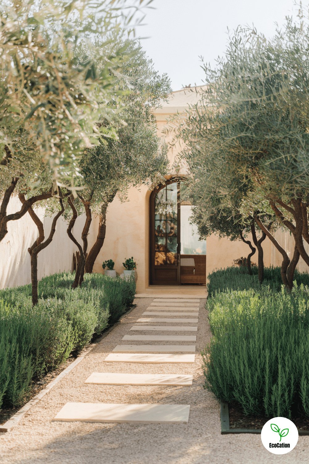 Bring the warmth of the Mediterranean to your front yard with olive trees, rosemary hedges, and warm-toned gravel paths. These sun-loving plants create a tranquil, sun-kissed atmosphere perfect for full sun exposure. Add a stone pathway for a rustic, timeless feel and enjoy the lush aroma of herbs and greenery.