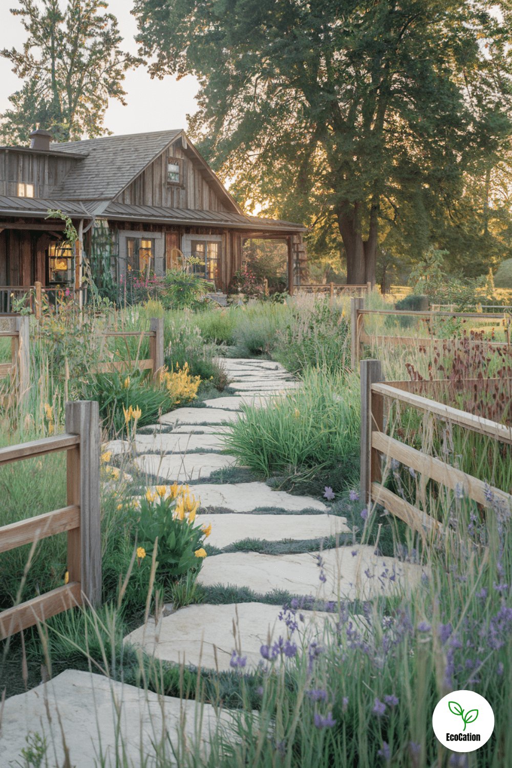 Embrace a rustic, natural front yard with sprawling wildflowers, wooden fences, and a winding stone path. Native sun-loving plants like wildflowers add charm and simplicity to the landscape. This low-maintenance option is perfect for those who want a sun-drenched, nature-inspired front yard with a relaxed, rustic feel.