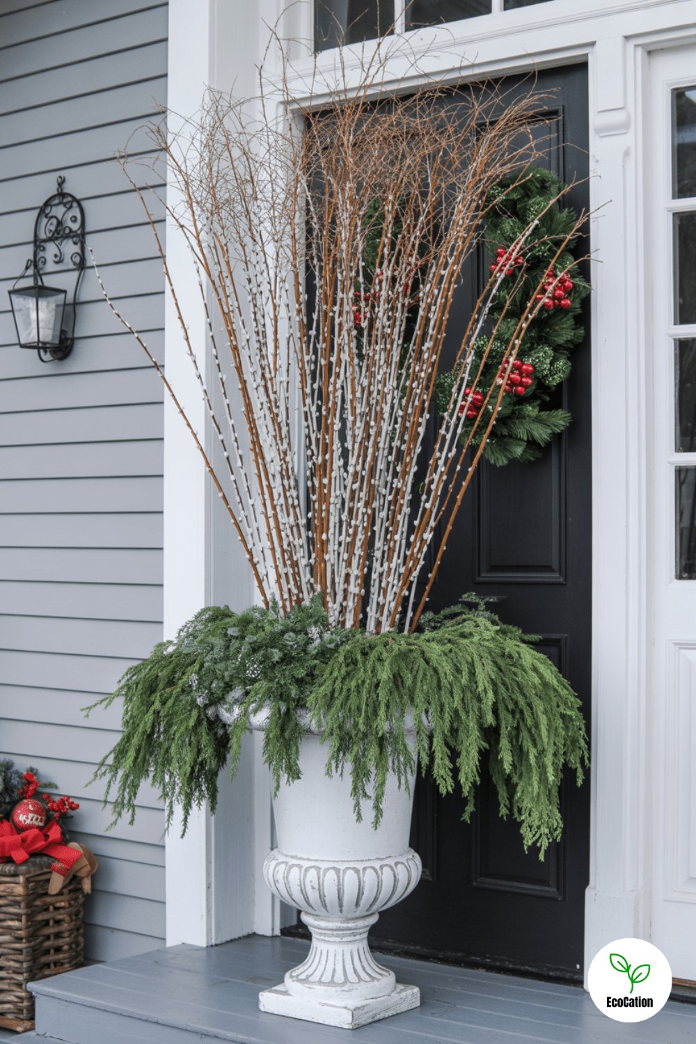 Fill tall Christmas urns with cascading pine and extremely tall, thick curly willow branches painted white. This arrangement adds dramatic vertical interest and a touch of modern elegance.