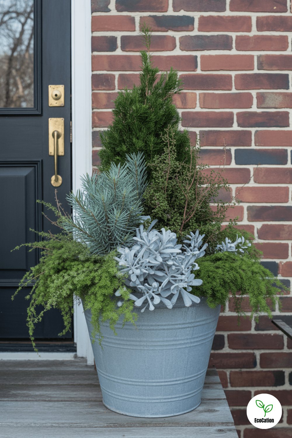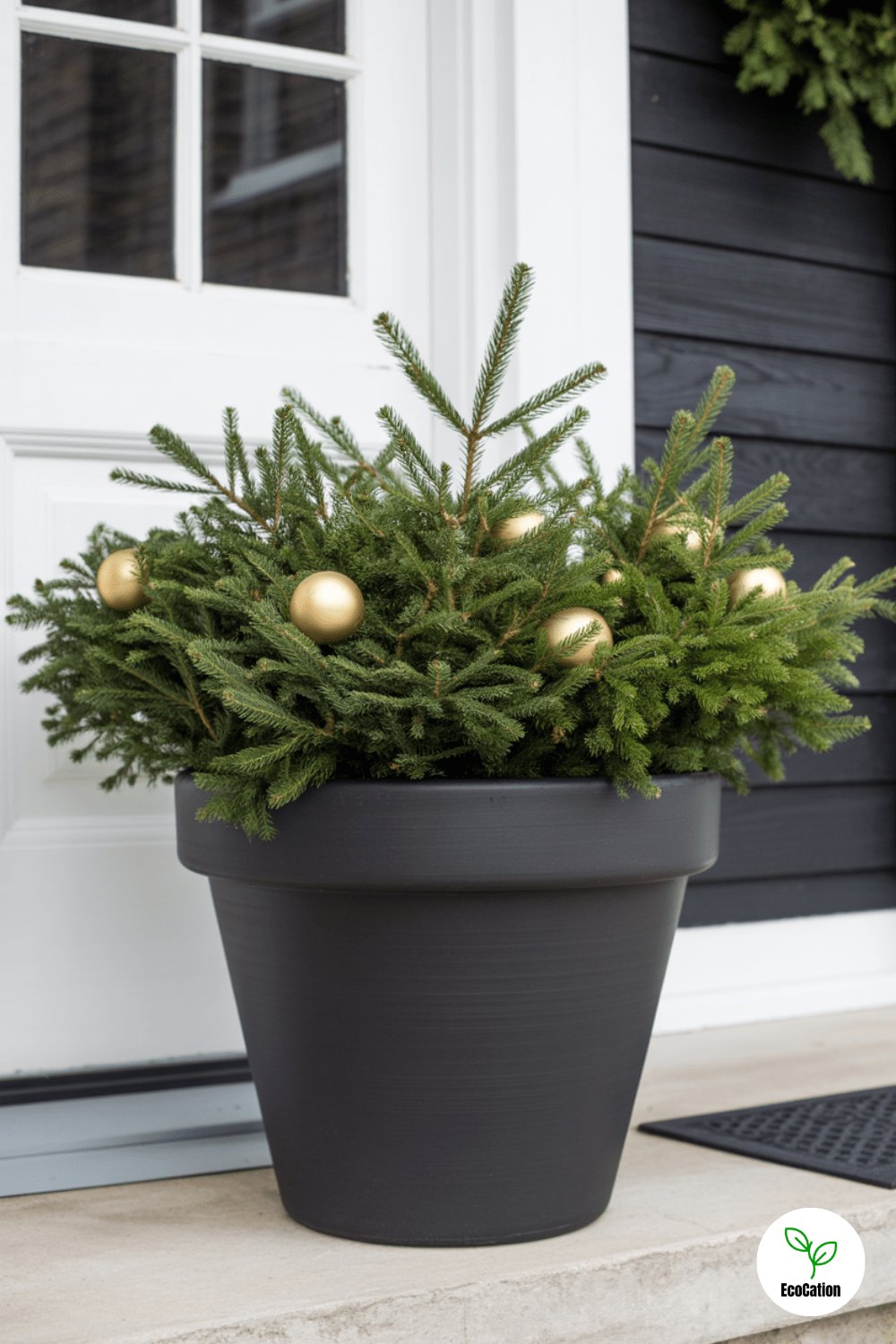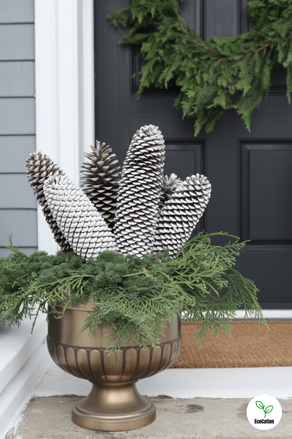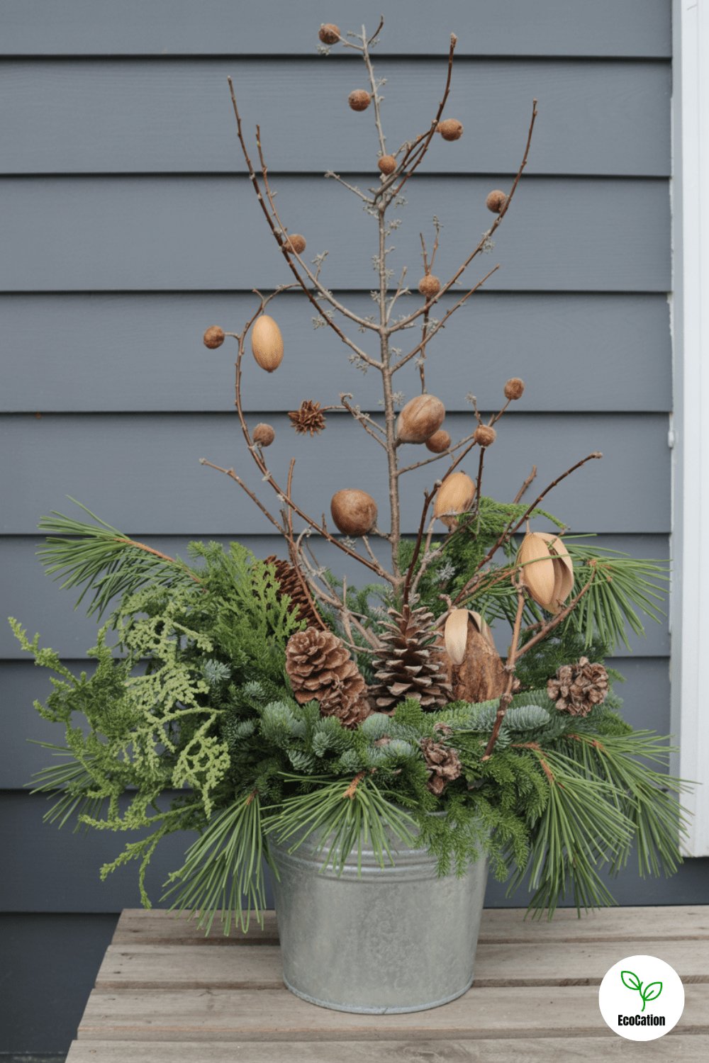 Focus entirely on nature by filling your planters with pine, fir, hemlock, various seed pods, and twigs, avoiding synthetic decorations. This creates a truly organic and authentic holiday display.