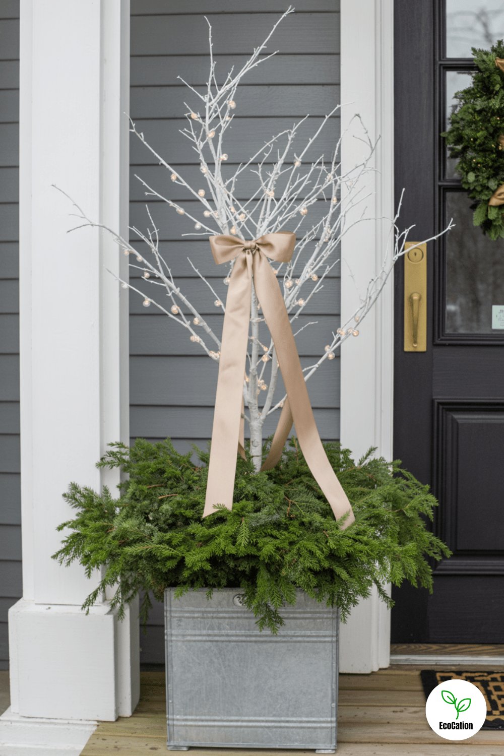 Infuse your planters with sophistication using white painted branches, champagne-colored ribbons, and delicate fairy lights woven through lush green boughs. This combination exudes elegance and creates a truly enchanting display.