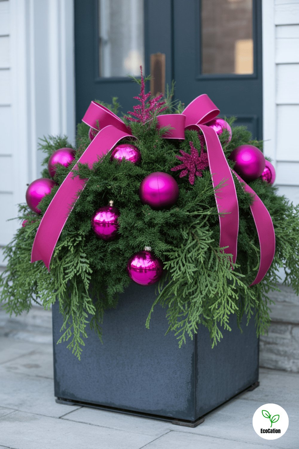 Inject a vibrant twist with deep green foliage paired with non-traditional, eye-catching magenta-colored ribbon and bulb ornaments. This bold color scheme invigorates traditional winter planters.