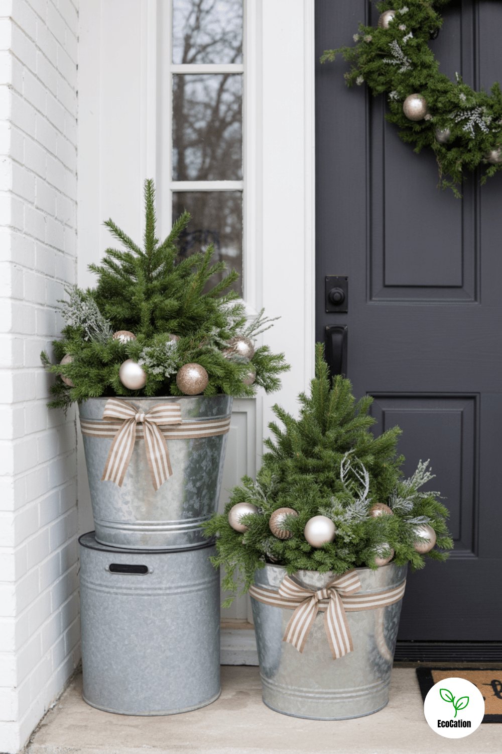 Give your planters a modern farmhouse feel by using galvanized metal buckets. Fill them with subtle greenery and neutral-toned ribbons for a rustic yet chic look. You can easily drill drainage holes in the bottom of the buckets to keep your greenery fresh.
