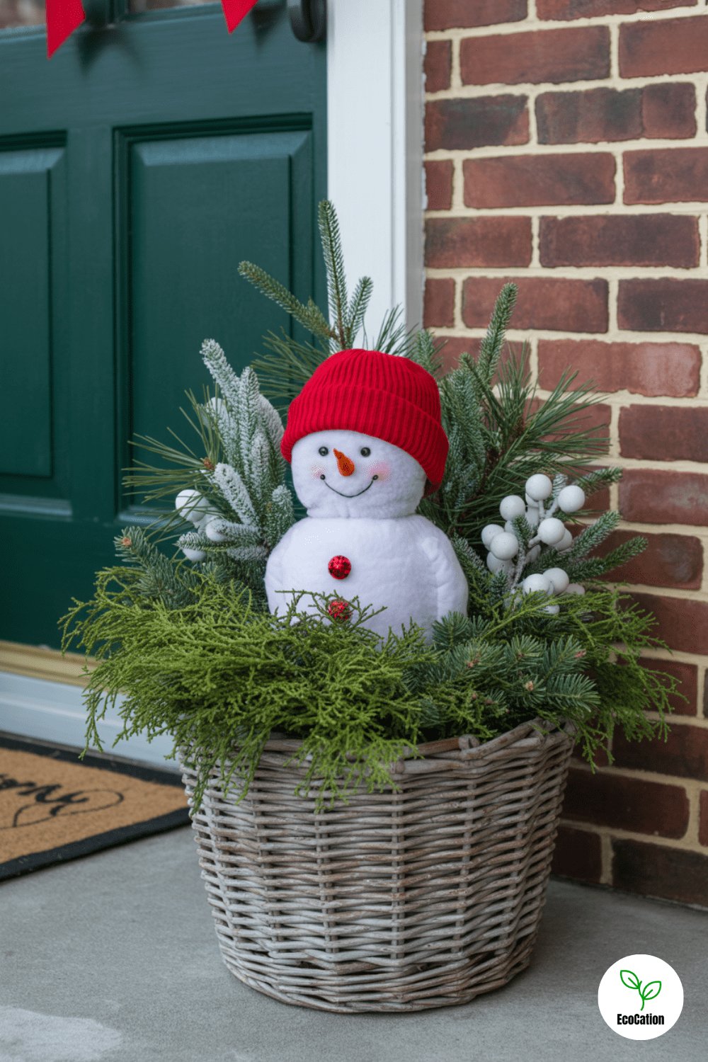 Add a touch of whimsy with a small, cheerful decorative snowman nestled amongst green branches and white-tipped pine. This playful look is sure to bring smiles to passersby.