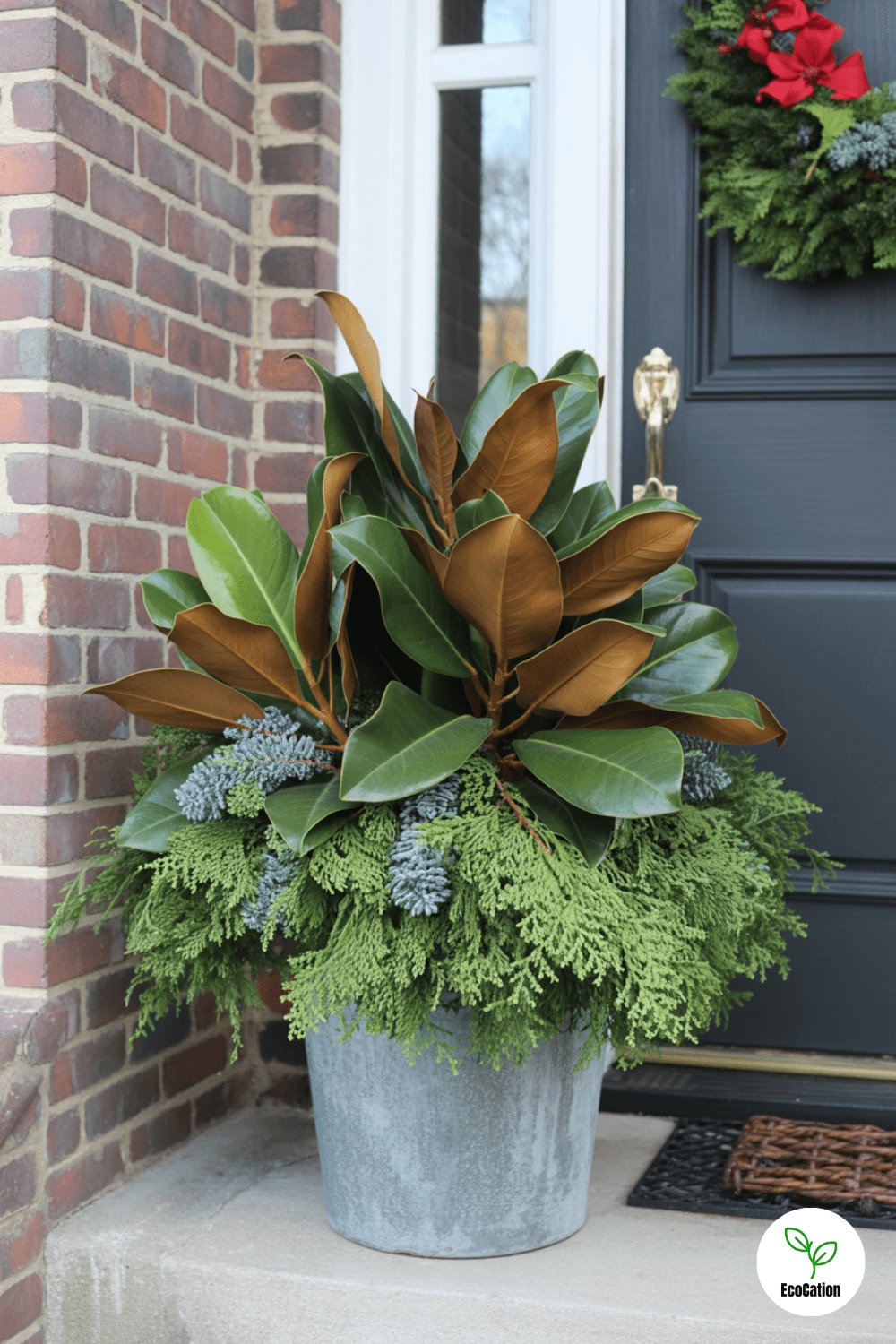 Create an elegant display with a luxurious mix of cedar greenery and large, glossy magnolia leaves, showcasing their rustic brown backs. The contrast in textures and colors is simply stunning.