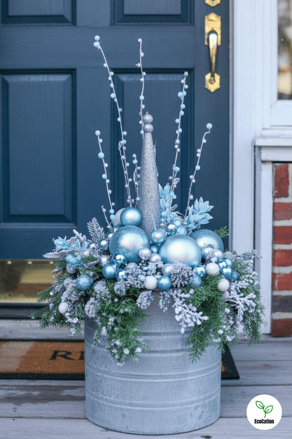 Create a beautiful frozen look with frosted greenery, light blue ornaments, and silver glittery picks. This will give your planters an ethereal, winter wonderland feel. A quick spray of artificial snow can enhance this frosted effect.