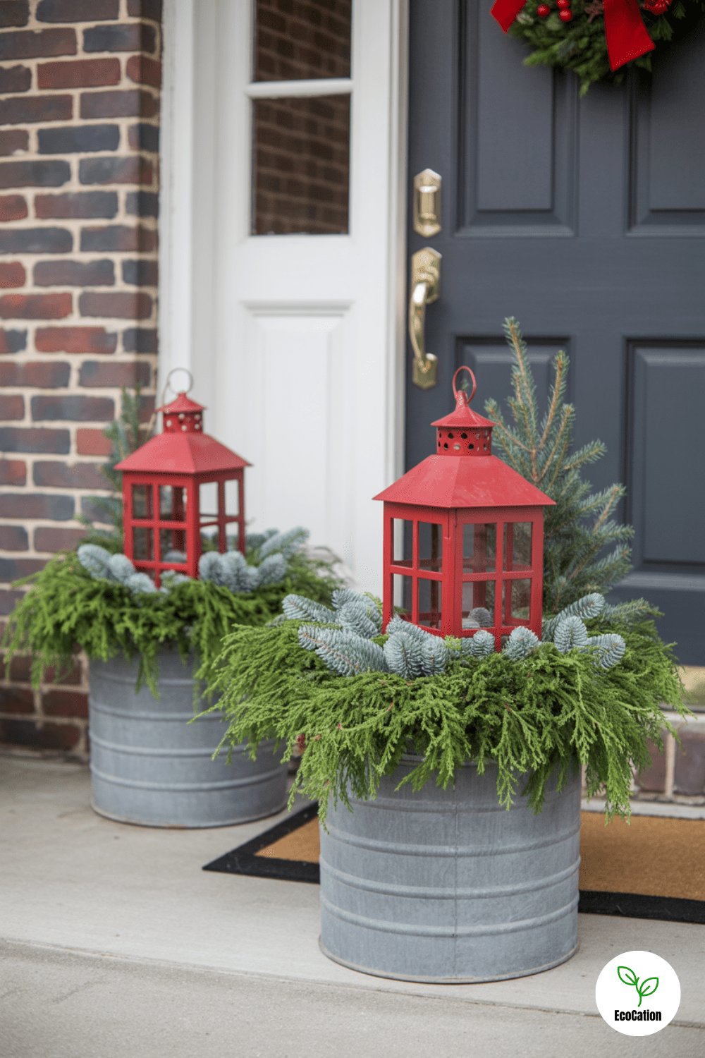 Flank your front door with matching planters that feature a large red decorative lantern nestled among spruce and boxwood. The soft glow of the lantern will create an inviting and cozy atmosphere. Don t forget to use LED lanterns for safety and longevity.