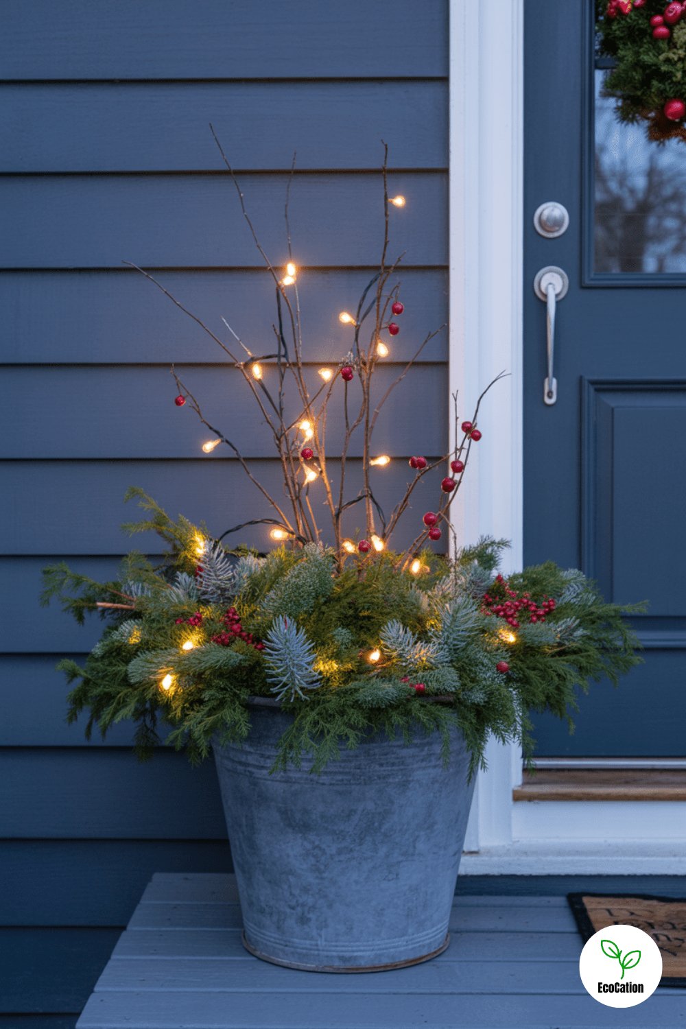 Ensure your planters glow warmly at dusk with embedded, battery-operated string lights amongst the foliage and berry sprigs. This creates a magical welcome for evening visitors. Opt for lights with a timer function for convenience.