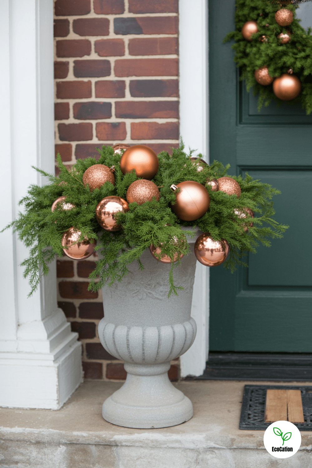 Enhance your Christmas urns appeal with metallic copper-colored baubles interspersed throughout the green foliage, catching the light beautifully on the front porch. The warm metallic tones add a touch of luxury.