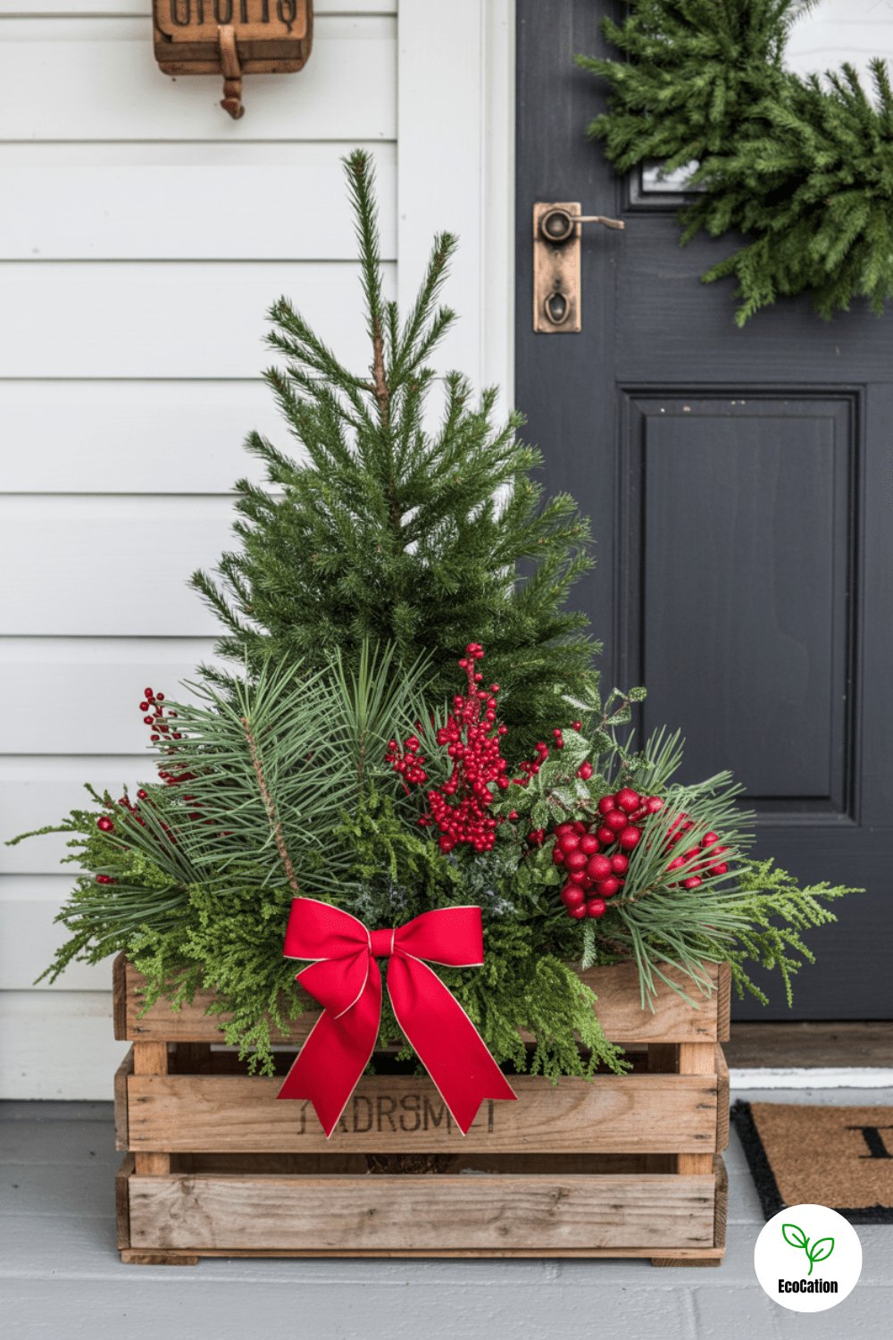 Skip the traditional pot and use a vintage wooden crate for a unique DIY planter. Fill it with assorted pines and a bold red bow for a rustic statement piece. Line the crate with a plastic bag to protect the wood and retain moisture.