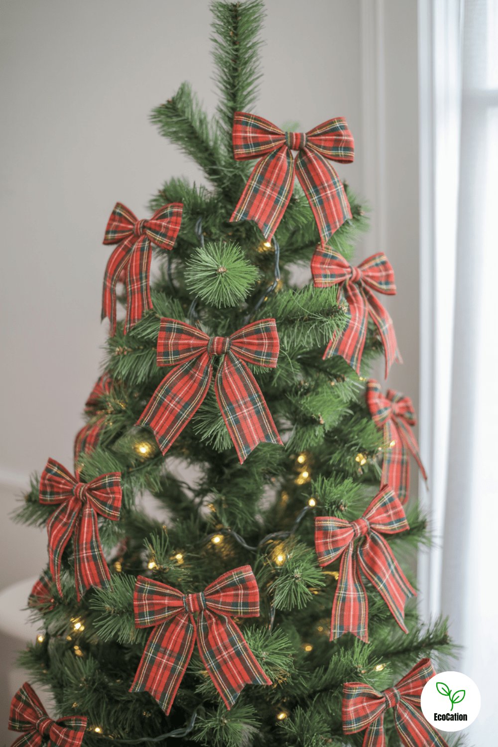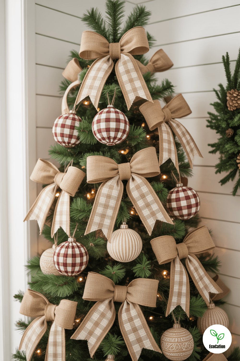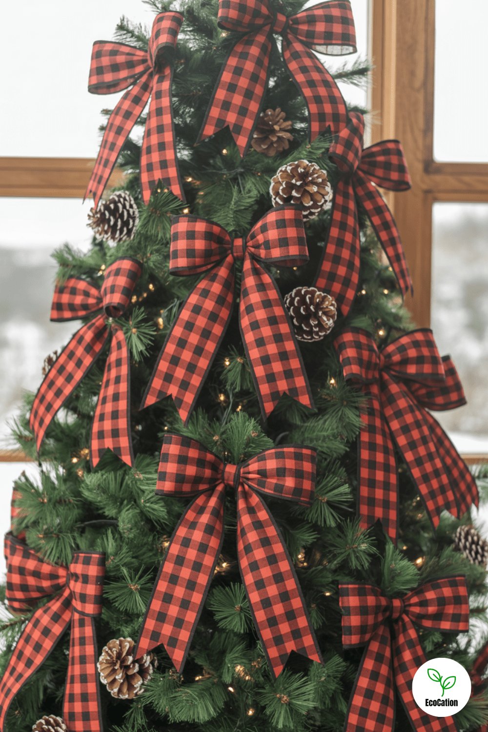 Embrace the ultimate cozy holiday feeling with a classic cabin-inspired tree using bold, rustic plaid. Large Christmas tree bows crafted from black and red buffalo plaid ribbon instantly evoke a fireside warmth. Mix these plaid bows with natural elements like rustic pinecones and simple fairy lights for that authentic cabin aesthetic.