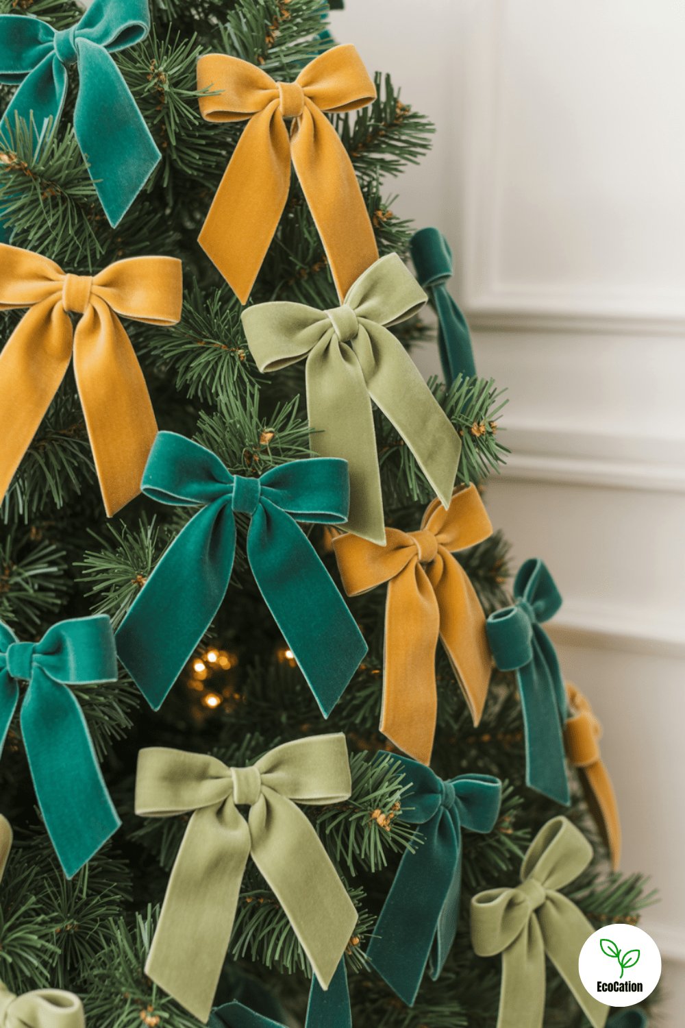 For a unique and sophisticated holiday palette, step outside the box with unexpected velvet colors. Adorn your tree with deep forest green and mustard yellow velvet bows for a refined, almost mid-century modern feel. The combination of unexpected color and soft texture will make your tree truly memorable.
