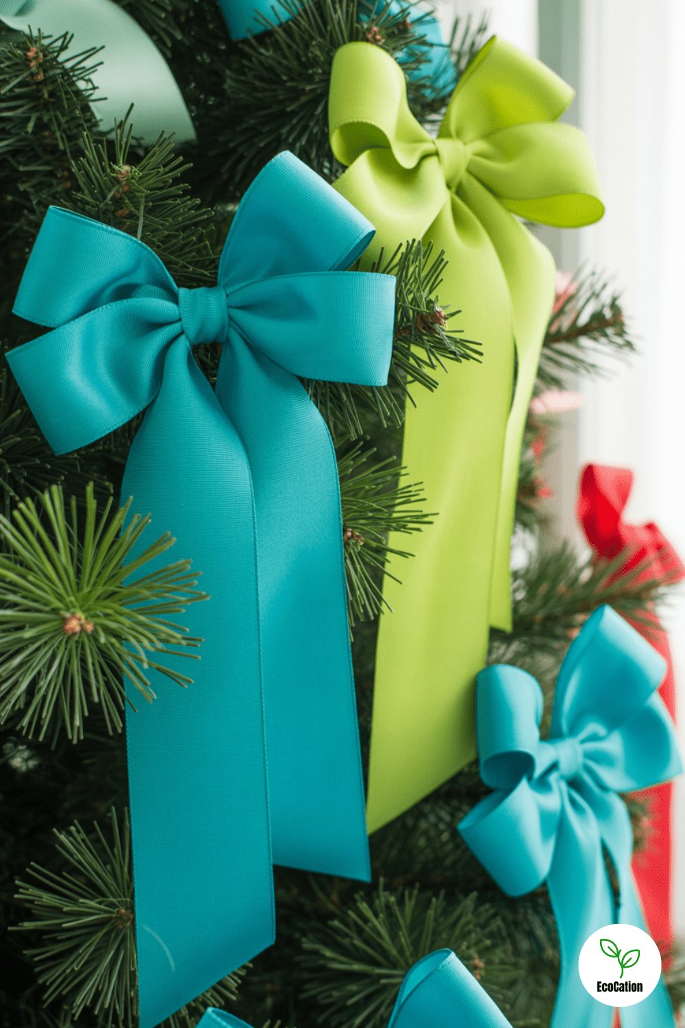 Dare to be different by using a vibrant and surprising color palette for a fun, modern twist on holiday decor. Tying bold ribbons like turquoise, lime green, or hot pink onto a traditional dark green tree creates a cheerful and energetic look. If you re nervous about the mix, stick to using only two contrasting ribbon colors to keep the design intentional.