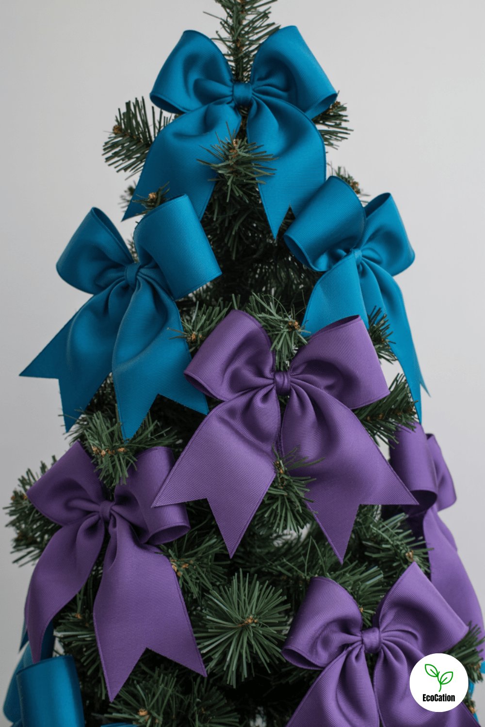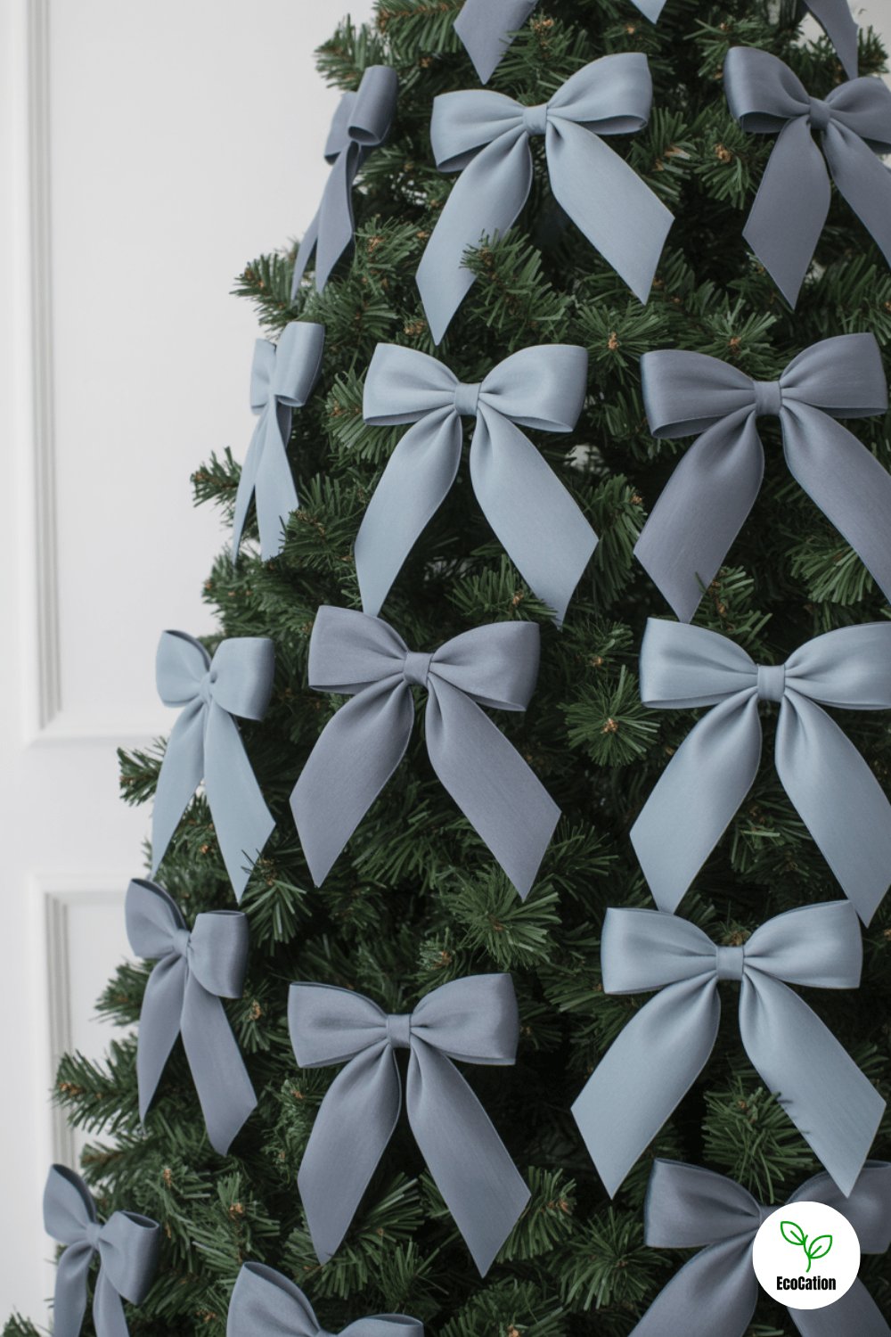 For a calm, sophisticated, and contemporary approach, organize your tree around a single, soothing color in various shades. Tie all your Christmas tree bows in different tones of grey-blue ribbon, ranging from slate to dusty periwinkle, to create subtle depth. This monochromatic scheme is restful and highly refined.