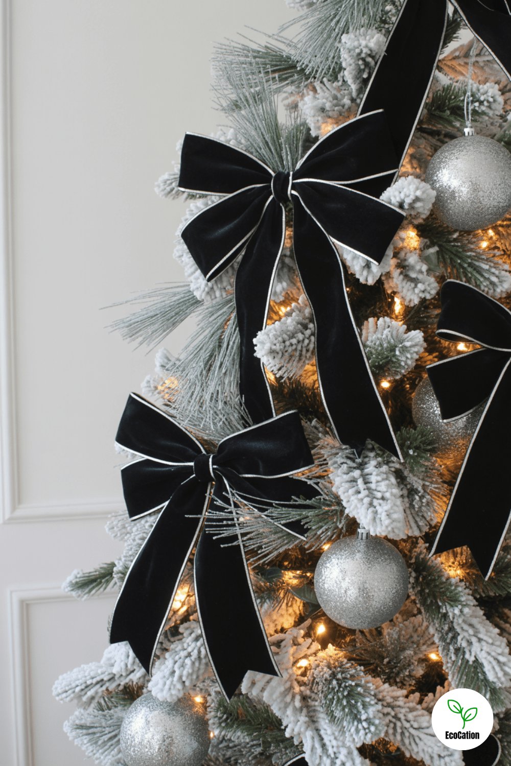 Achieve a stunning, high-impact look by pairing bold black bows with the stark white of a flocked tree. Use large, structured Christmas tree bows in matte black to create a sharp contrast against bright silver ornaments and white lights. This combination is incredibly chic and visually striking.