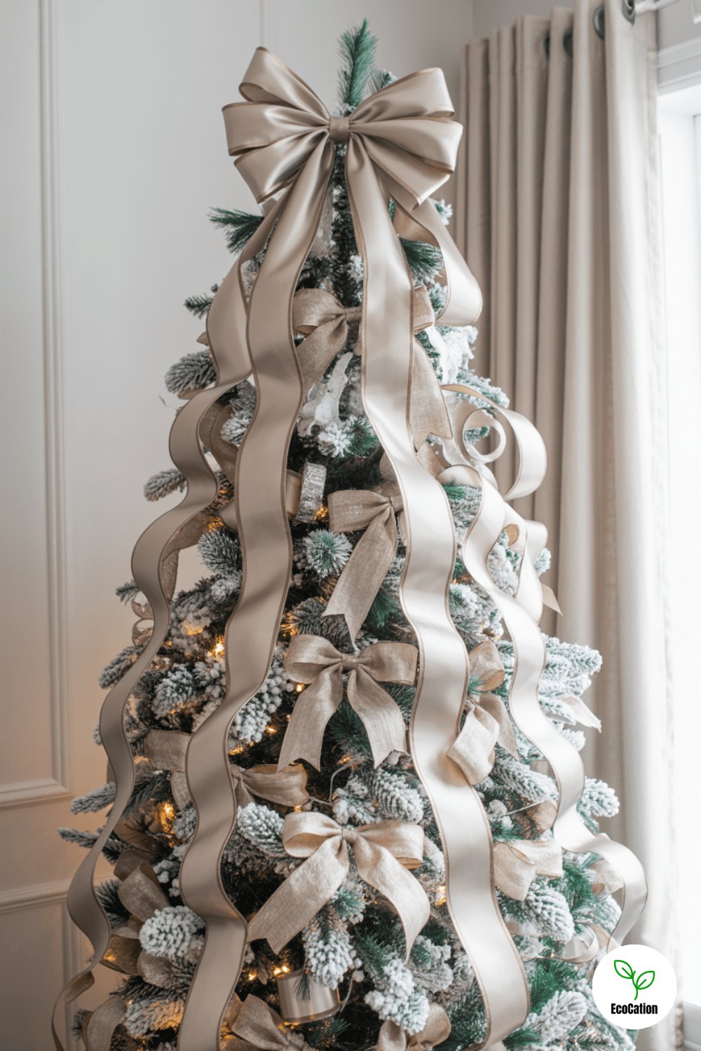 If you prefer a sophisticated, high-end aesthetic, let your bows do the talking with a touch of luxury. Choose ribbons in metallic or muted shades like champagne, silver, or taupe, and tie them into long, flowing bows that gracefully drape down the branches. To really nail this look, consider a flocked tree the white branches provide a gorgeous contrast to the shimmering ribbons.