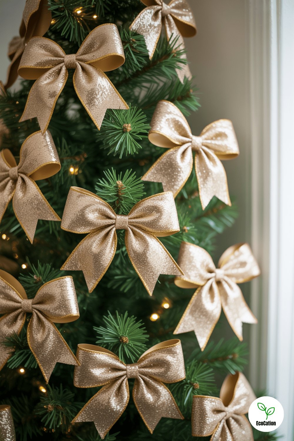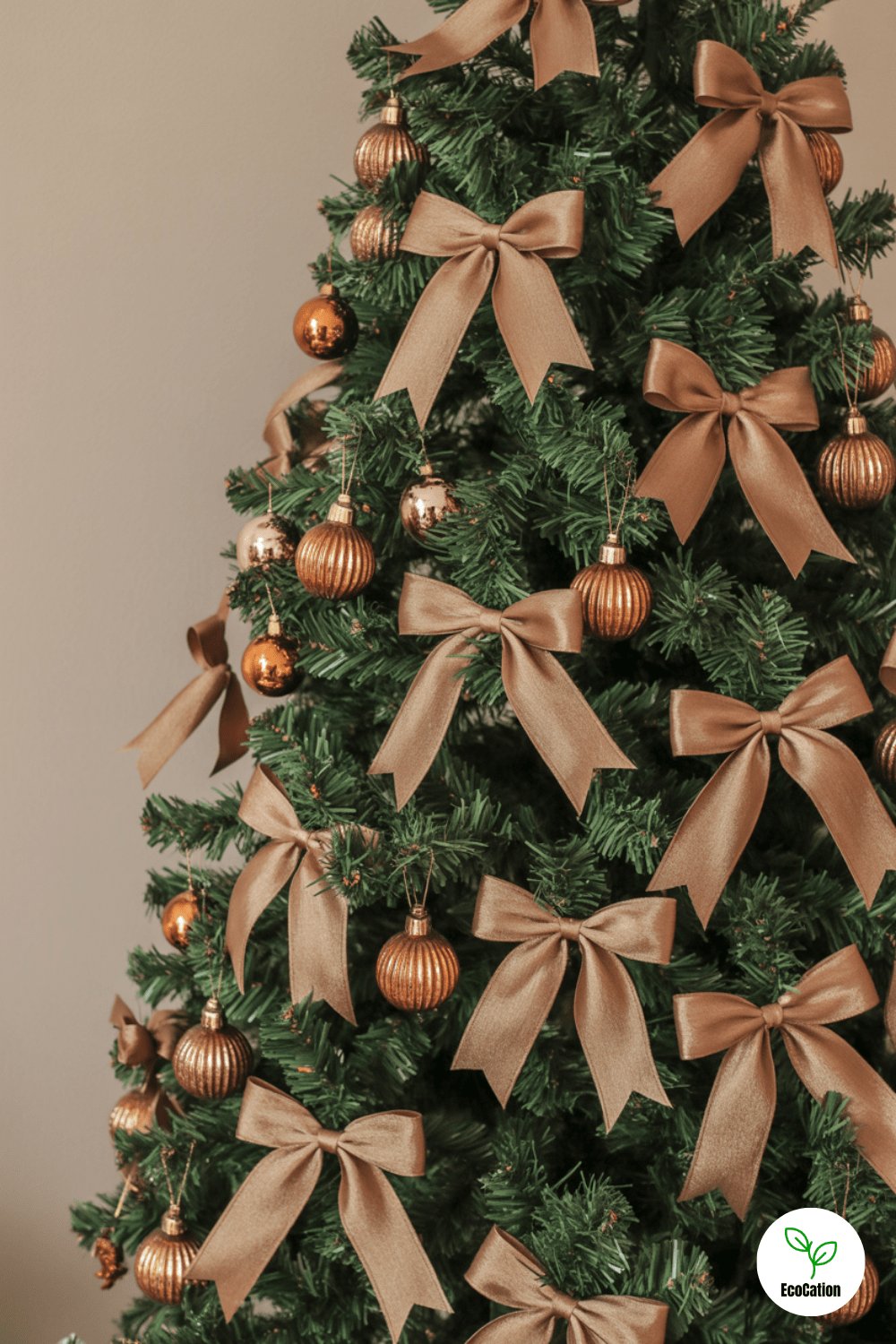 If you want your tree to catch every available light, choose bows made from shimmering, glitter-infused gold or bronze ribbon. These bows are incredibly easy to DIY and add an instant boost of celebratory sparkle to the branches. Vary the size of your gold Christmas tree bows slightly for a more dynamic and handcrafted appearance.
