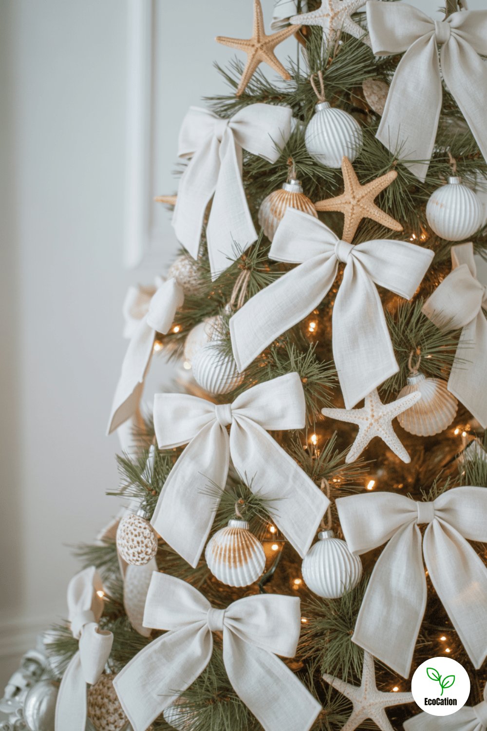 Bring a peaceful, seaside vibe to your holiday decor by using light, airy bows and a coastal theme. Decorate a light-colored tree with sheer white linen Christmas tree bows interspersed with unique ornaments like starfish and seashells. Tie your bows loosely to mimic the gentle flow of ocean waves.