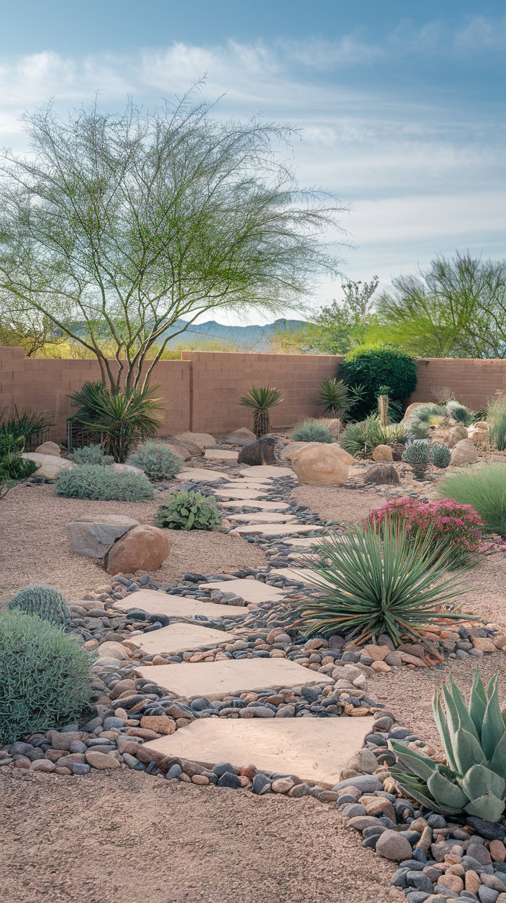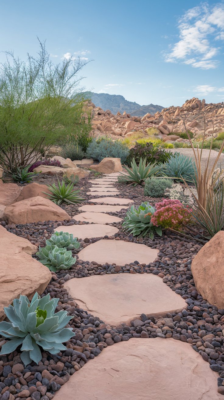 Create a sandstone pathway surrounded by drought-tolerant plants. Use sandstone slabs to build a natural-looking trail, and border it with colorful desert blooms like lavender or yucca. These plants add life to the pathway while requiring minimal water.