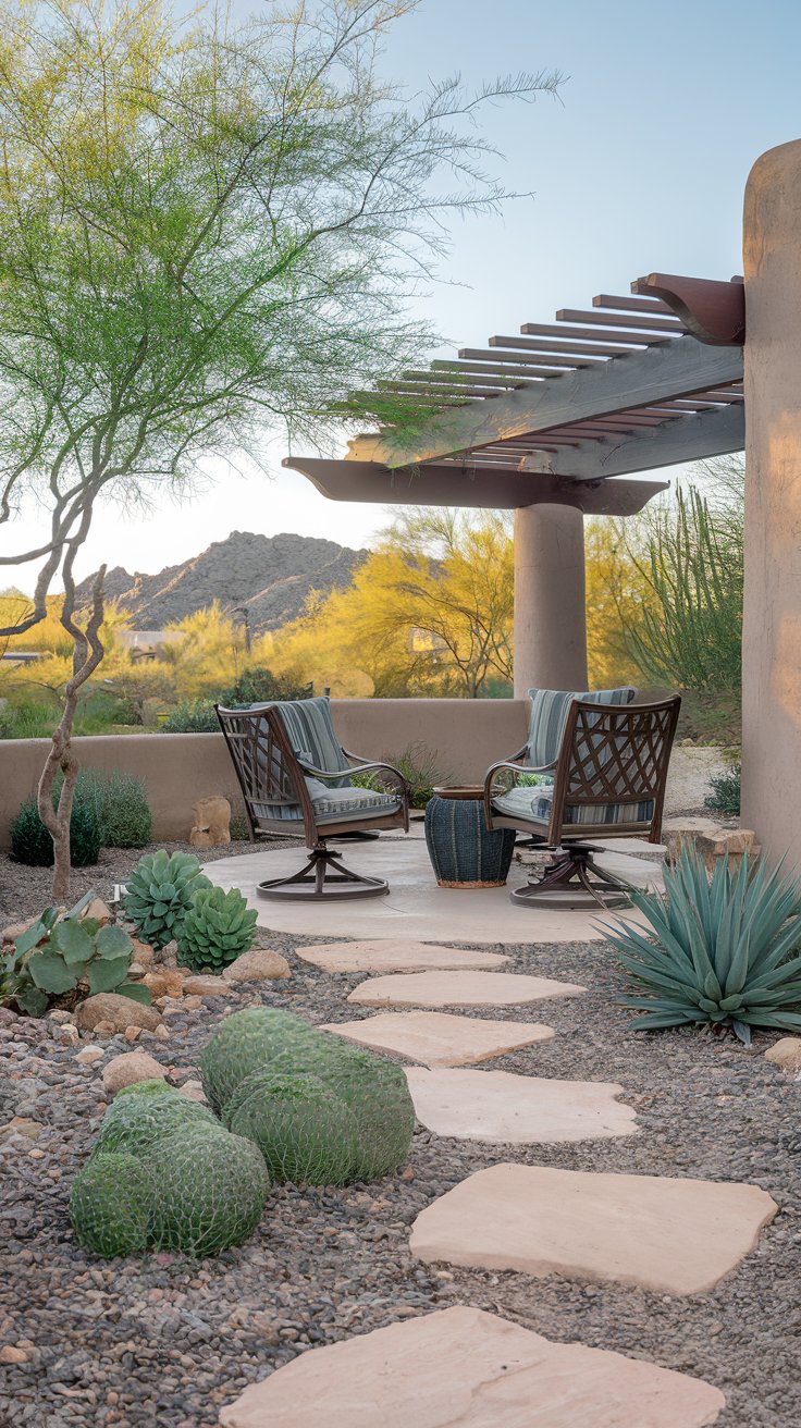 Add a pergola over a cozy patio and surround it with native desert plants and gravel. Opt for lightweight, breathable fabrics for the pergola to provide shade while blending with the natural landscape. Complement the space with desert wildflowers to bring color and charm.