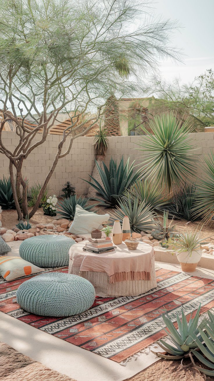 Style your desert garden with boho-inspired decor like patterned rugs and low tables. Surround the area with potted succulents, cacti, and flowering desert plants. Add hanging lanterns or fairy lights for a cozy, inviting atmosphere.