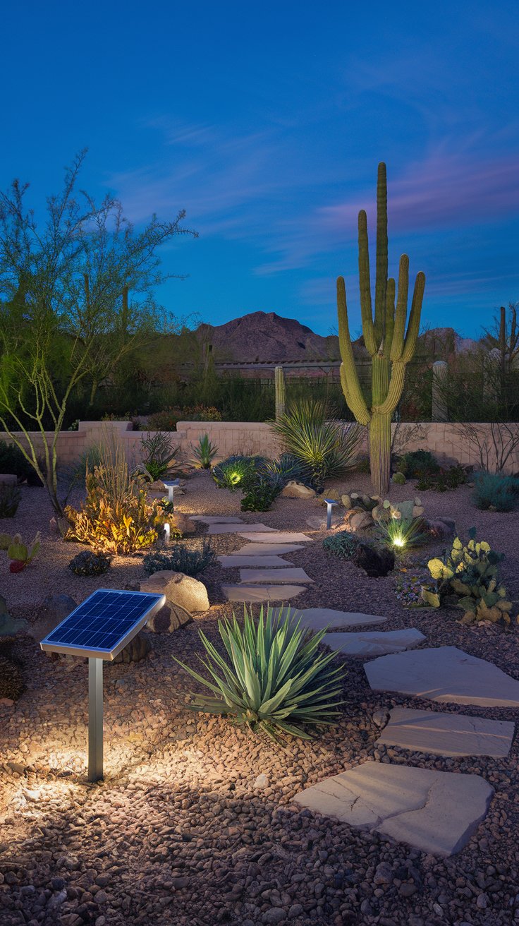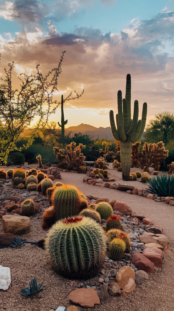 Design a desert garden that shines at sunset with tall cacti casting dramatic silhouettes. Arrange cacti in varying heights and place low shrubs around the base to enhance the visual depth. Add outdoor lighting for a magical evening ambiance.