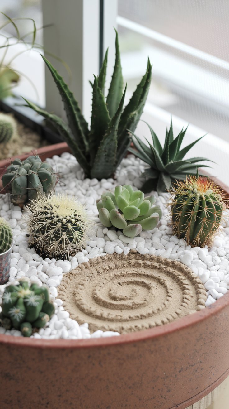 Create a space-saving mini garden with tiny cacti and intricate sand art. Use shallow trays or pots to arrange sand patterns and add small succulents for charm. This idea is perfect for urban balconies or compact spaces.