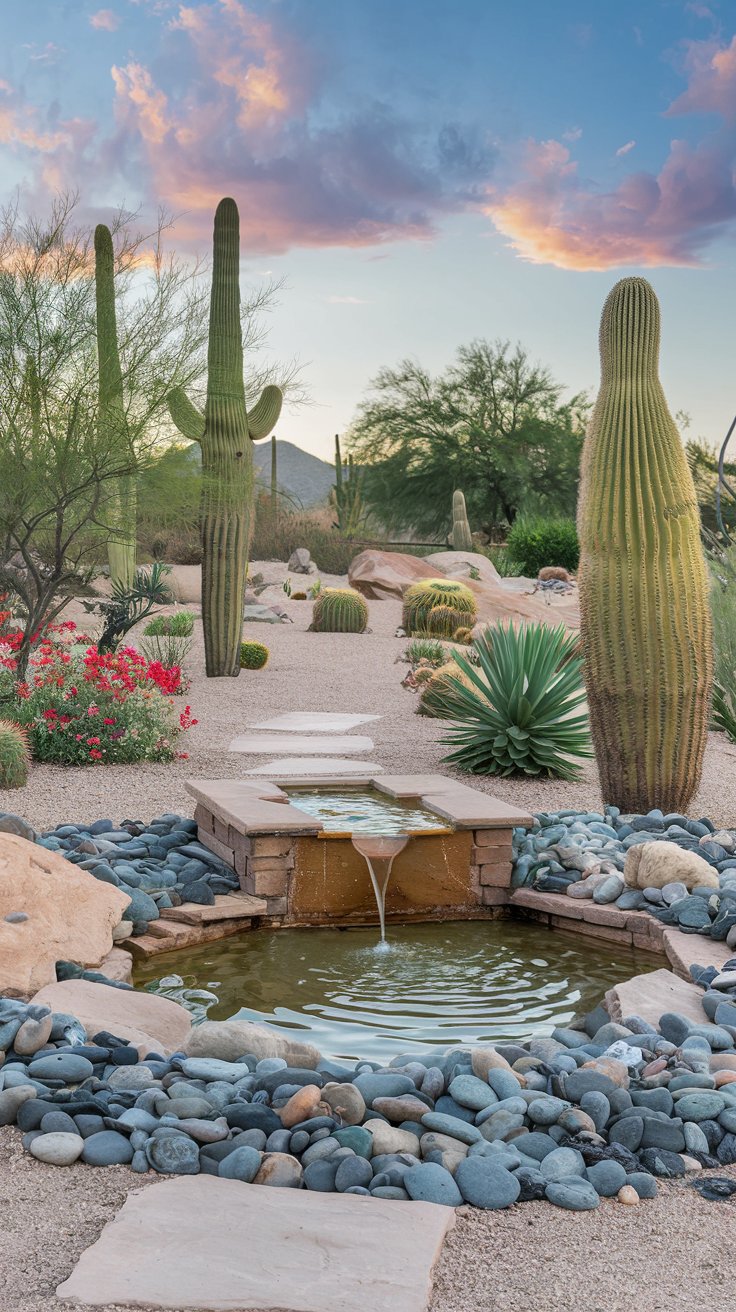 Add a small fountain surrounded by tall cacti and smooth pebbles to bring a soothing atmosphere to your garden. Position the fountain as the centerpiece and use the surrounding pebbles to highlight the water feature. Choose solar-powered options for an eco-friendly touch.