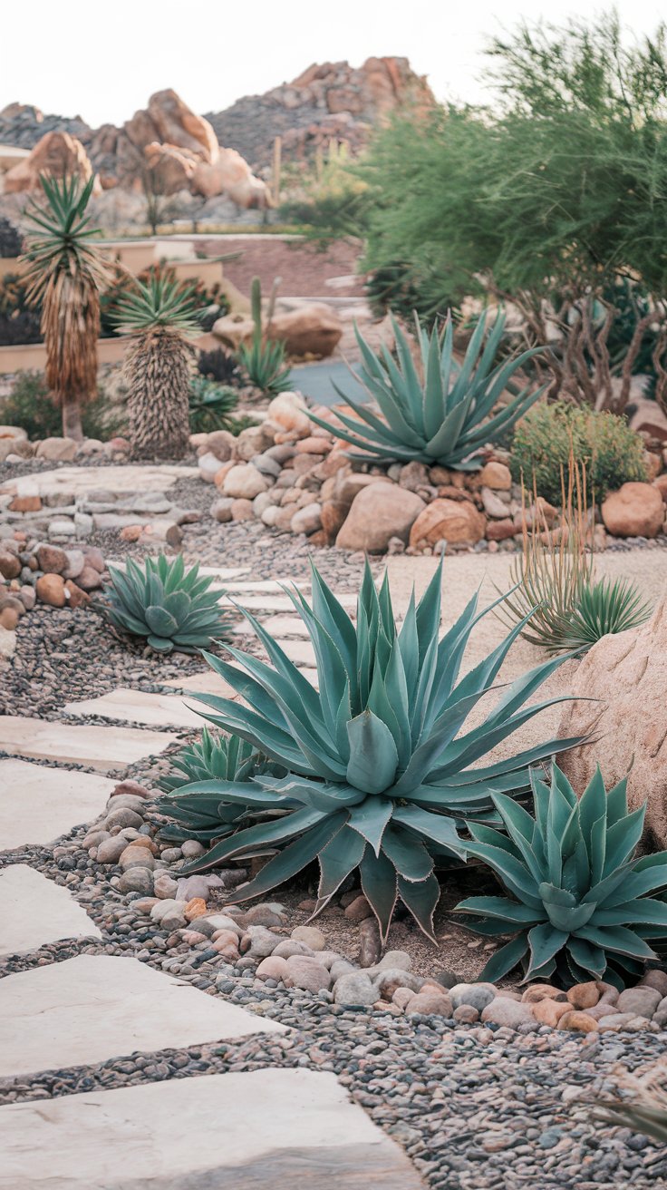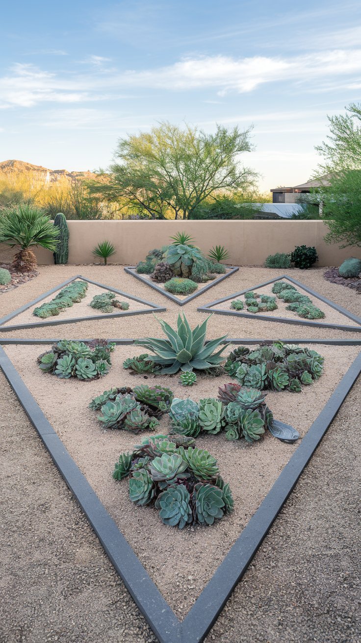 Arrange your desert garden with symmetrical triangular gravel beds and clusters of succulents. Use plants like aloe or barrel cacti for bold focal points. The clean lines and geometric shapes add a contemporary flair to your backyard.