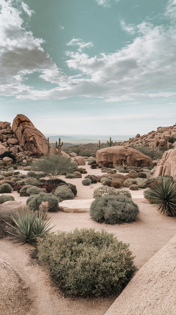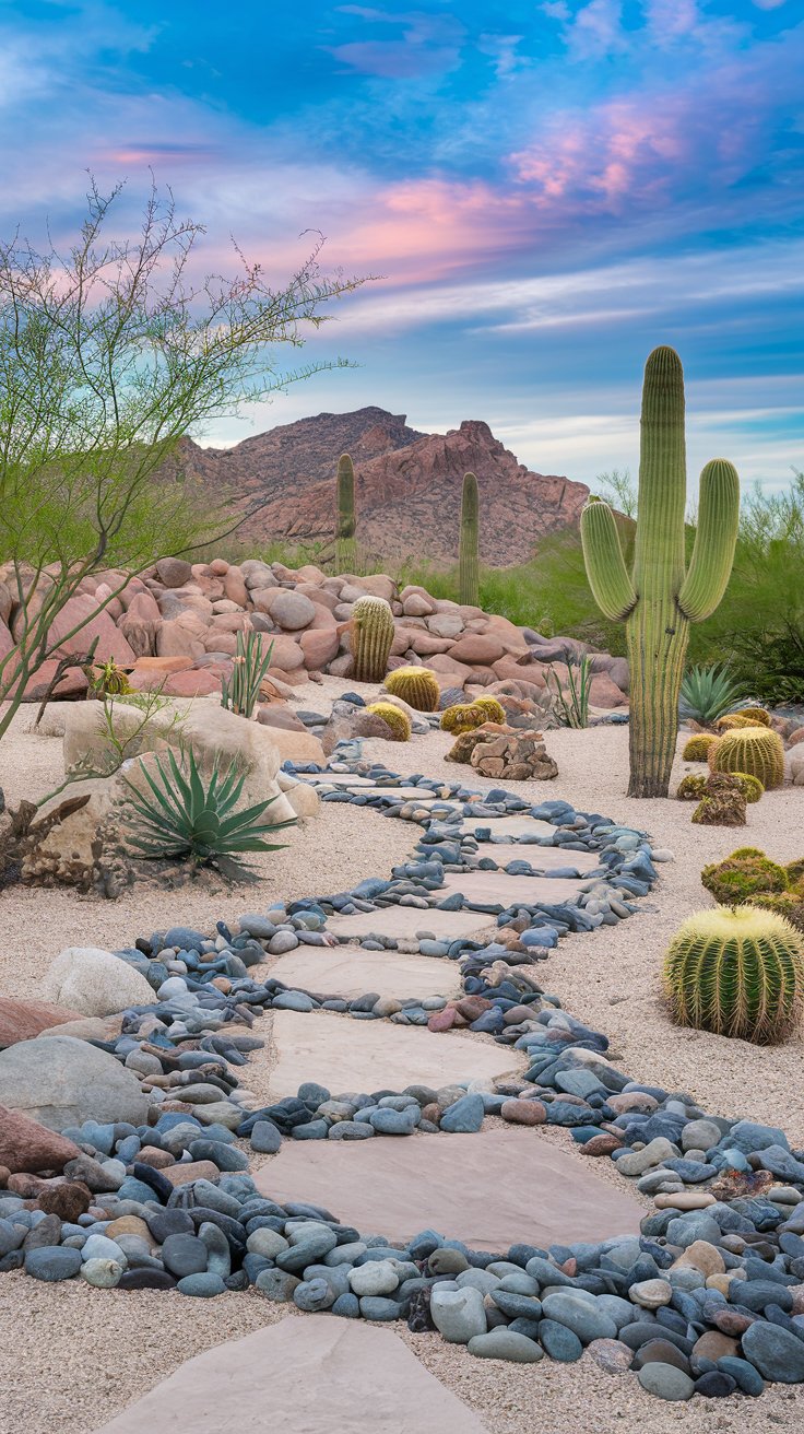 Design a serene desert garden with tall cacti, smooth pebbles, and a winding stone pathway. Strategically place different cacti species to create height variations and texture. Use smooth pebbles to outline the pathway for a polished look and add native drought-resistant plants alongside to soften the edges.