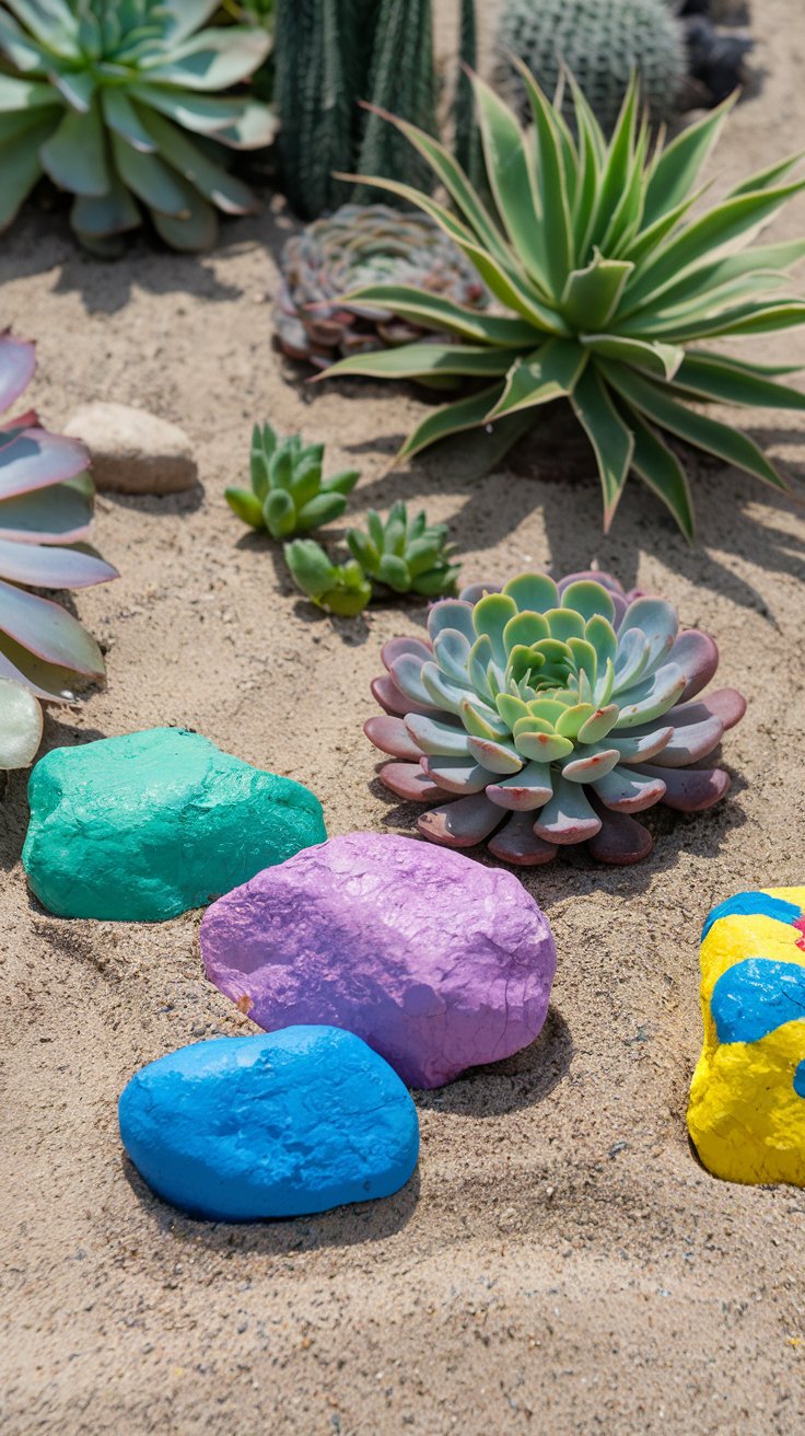 Add a fun touch to your desert garden by painting rocks in bright colors and placing them among succulents and sand. Use durable outdoor paint and get creative with patterns or designs. This idea is perfect for gardens with children.