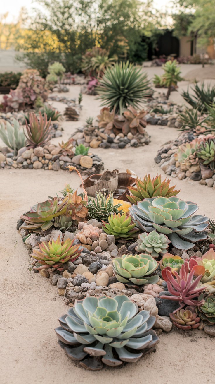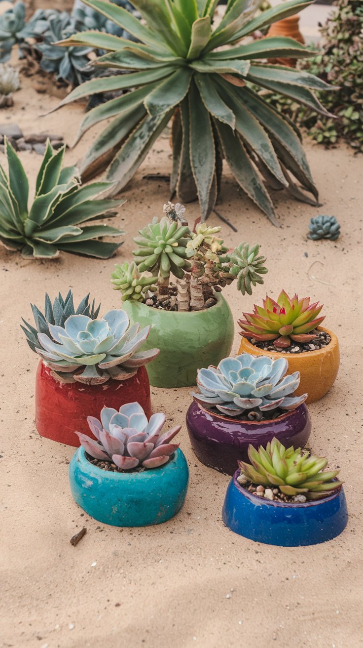 Arrange succulents in vibrant, artistic pots for a lively desert garden backdrop. Choose pots in bold hues that complement the natural tones of sand and rocks. Mix succulents with varying shapes and colors for visual appeal, placing them in sunny spots to thrive.