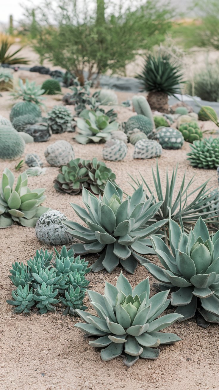 Design a monochrome desert garden with plants in shades of green and grey. Use silver-toned succulents, sage, and other drought-tolerant species to achieve harmony. Incorporate matching grey stones or gravel to complete the look.