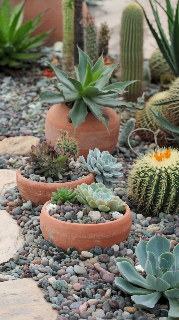 Transform a small area with terracotta pots filled with succulents and cacti. Select different pot sizes to add depth and layer them on low tables or along gravel paths. This setup works wonderfully for compact gardens or urban settings.