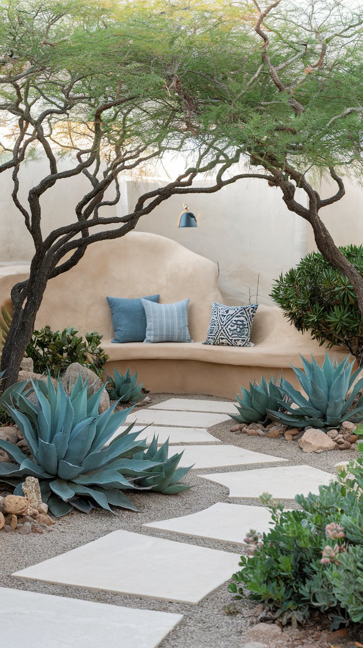 Set up a cozy seating area with a bench surrounded by agave plants and desert shrubs. Choose a rustic wooden bench to match the natural surroundings, and position it under a tree or shade sail for comfort.