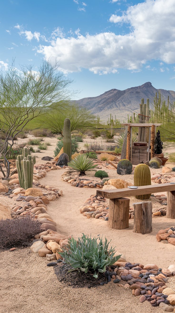 Design a rustic desert garden with wooden beams and vintage decor. Incorporate old wagon wheels, terracotta statues, or rustic lanterns to give the space character. Pair these elements with hardy plants like agave or yucca for a cohesive look.