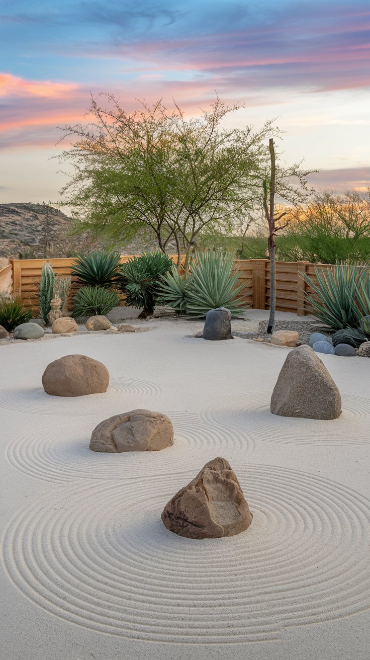 Craft a tranquil Zen-inspired desert garden with neatly raked sand patterns and strategically placed stones. Add a single, dramatic succulent or a bonsai-like cactus as a focal point, and use the raked sand to mimic flowing water for a peaceful vibe.