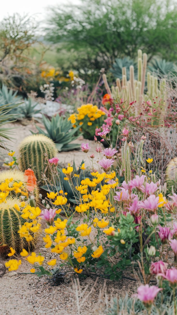Brighten your desert garden with wildflowers blooming among cacti and shrubs. Choose drought-tolerant varieties like desert marigolds or poppies to create bursts of vibrant color. Group wildflowers in clusters for a more natural, meadow-like effect.