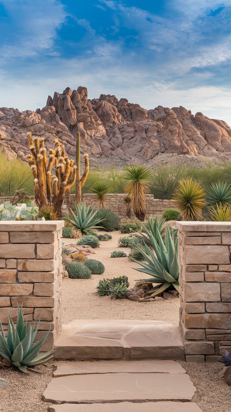 Install a stone archway leading into a peaceful desert garden. Surround the archway with aloe plants and yuccas to create a lush entrance. Use the arch to frame a picturesque view of your garden, enhancing its sense of serenity.