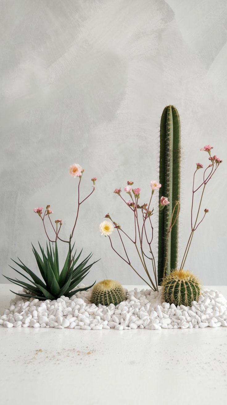 Keep it simple with white gravel, a tall cactus, and sparse desert flowers. This minimalist approach is perfect for creating a modern yet low-maintenance garden. Use plants like desert daisy or verbena for pops of subtle color.
