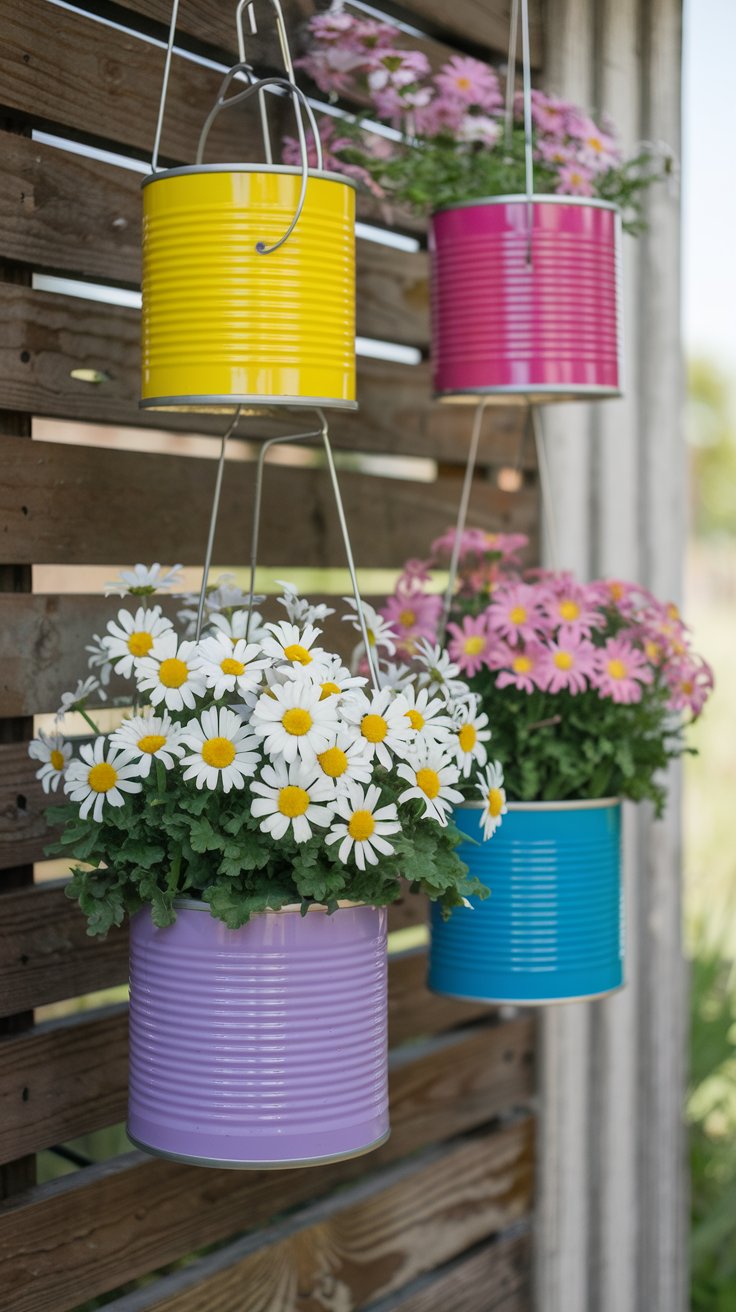 Give old tin cans a new purpose by turning them into cheerful hanging planters. Paint the cans in bright colors to make them pop, and fill them with daisies or other vibrant flowers. Drill drainage holes in the bottom of each can to prevent waterlogging, and hang them with sturdy cords or wires. This eco-friendly project is a fun and affordable way to add charm to your garden or balcony.
