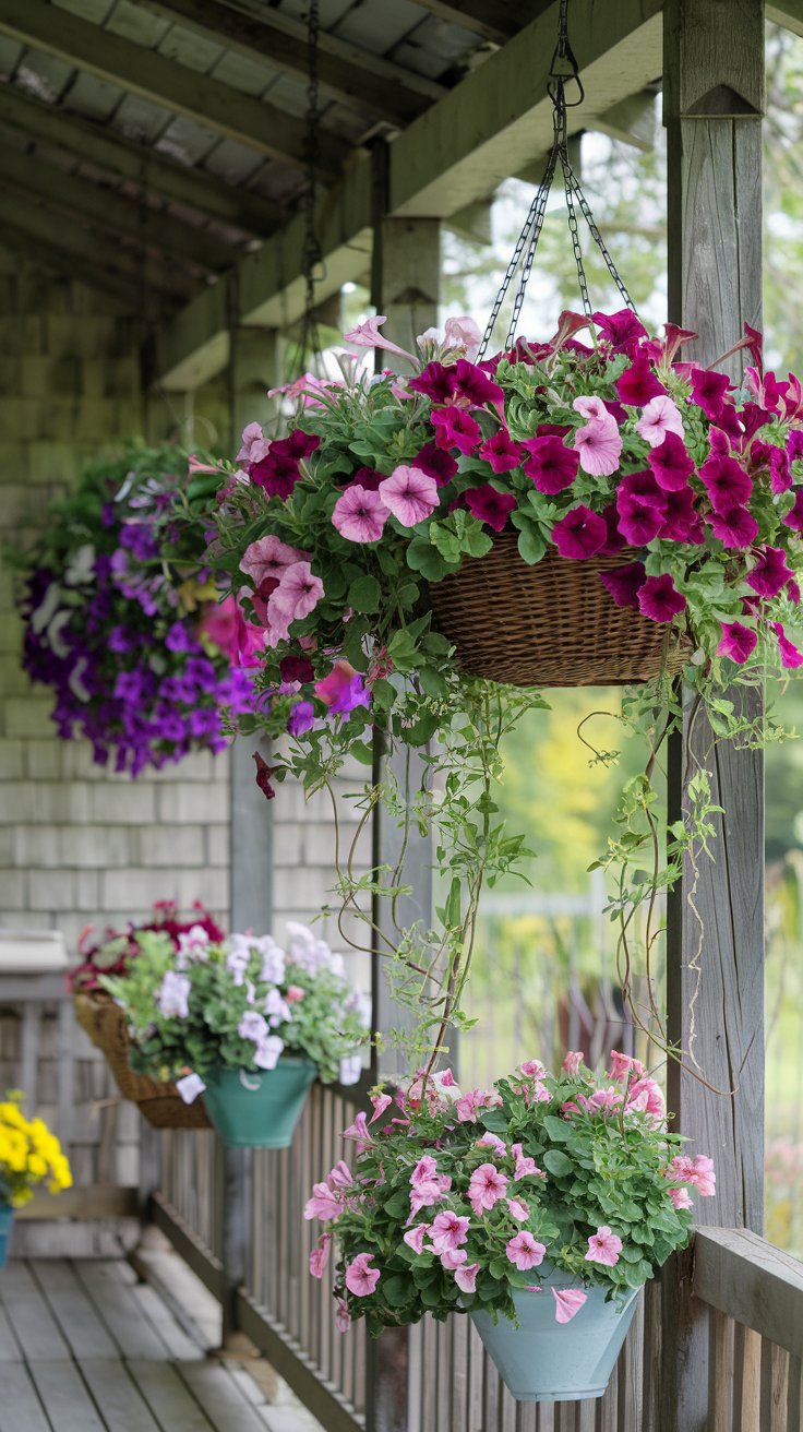 Add a touch of countryside charm to your porch with wicker baskets brimming with vibrant petunias and trailing vines. These baskets create a natural, colorful focal point that brightens any outdoor space. To keep the plants thriving, line the baskets with coconut coir, which helps retain moisture while adding to the rustic aesthetic. Position the baskets where they can catch plenty of sunlight, ensuring the petunias bloom in full splendor.