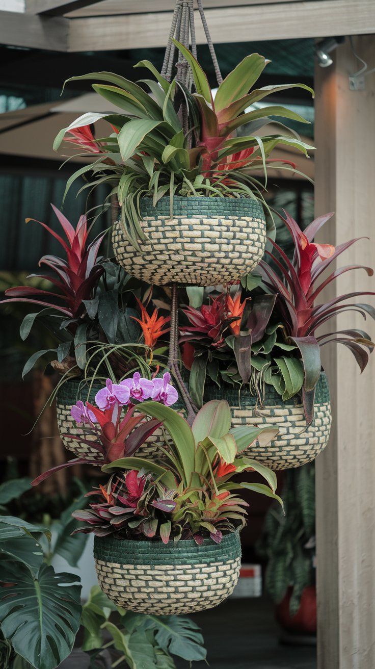 Create a lush tropical vibe by hanging woven baskets filled with vibrant plants like orchids or bromeliads. Arrange the baskets in a cluster for a dramatic effect and choose plants with bold colors and interesting textures. The natural fibers of the baskets complement the tropical greenery, making this setup ideal for a patio or sunroom. Use strong hooks to secure the baskets and mist the plants regularly to maintain humidity.