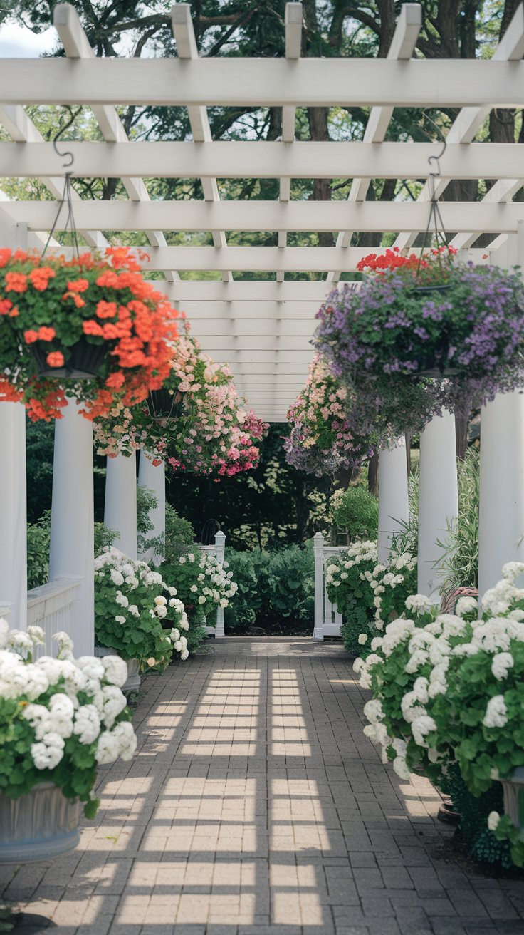 Add a touch of seasonal flair to your outdoor decor by adorning a pergola with hanging planters filled with blooming geraniums. The vibrant blooms are perfect for summer gatherings, creating a festive and inviting atmosphere. Deadhead the flowers regularly to encourage new growth and keep the planters looking fresh. Choose sturdy hooks for hanging and arrange the planters at varying heights to create a layered effect.
