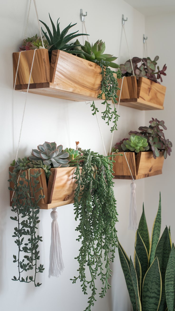 Combine storage and greenery by building wooden shelves with attached hanging planters. Display a variety of succulents and trailing vines for a dynamic and textured look. Adjustable brackets allow you to customize the height and arrangement, making this project versatile for any room. Use planters in different sizes to create visual interest, and position the shelves near a light source to keep your plants thriving.