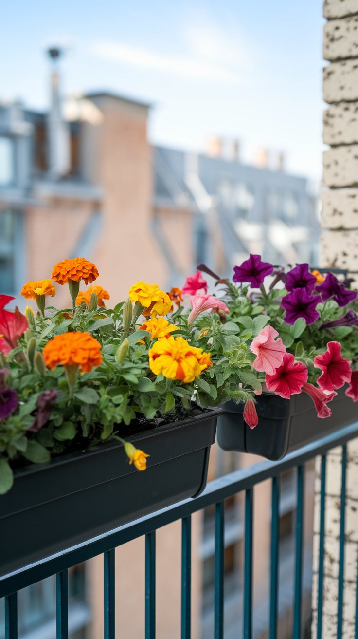 Maximize the use of your balcony space with compact hanging planter boxes filled with bright marigolds and petunias. Secure the boxes tightly to the railing with zip ties to prevent movement during windy days. This setup not only adds color but also makes efficient use of limited space, turning your balcony into a cheerful garden retreat. Position the boxes to catch plenty of sunlight for vibrant blooms.