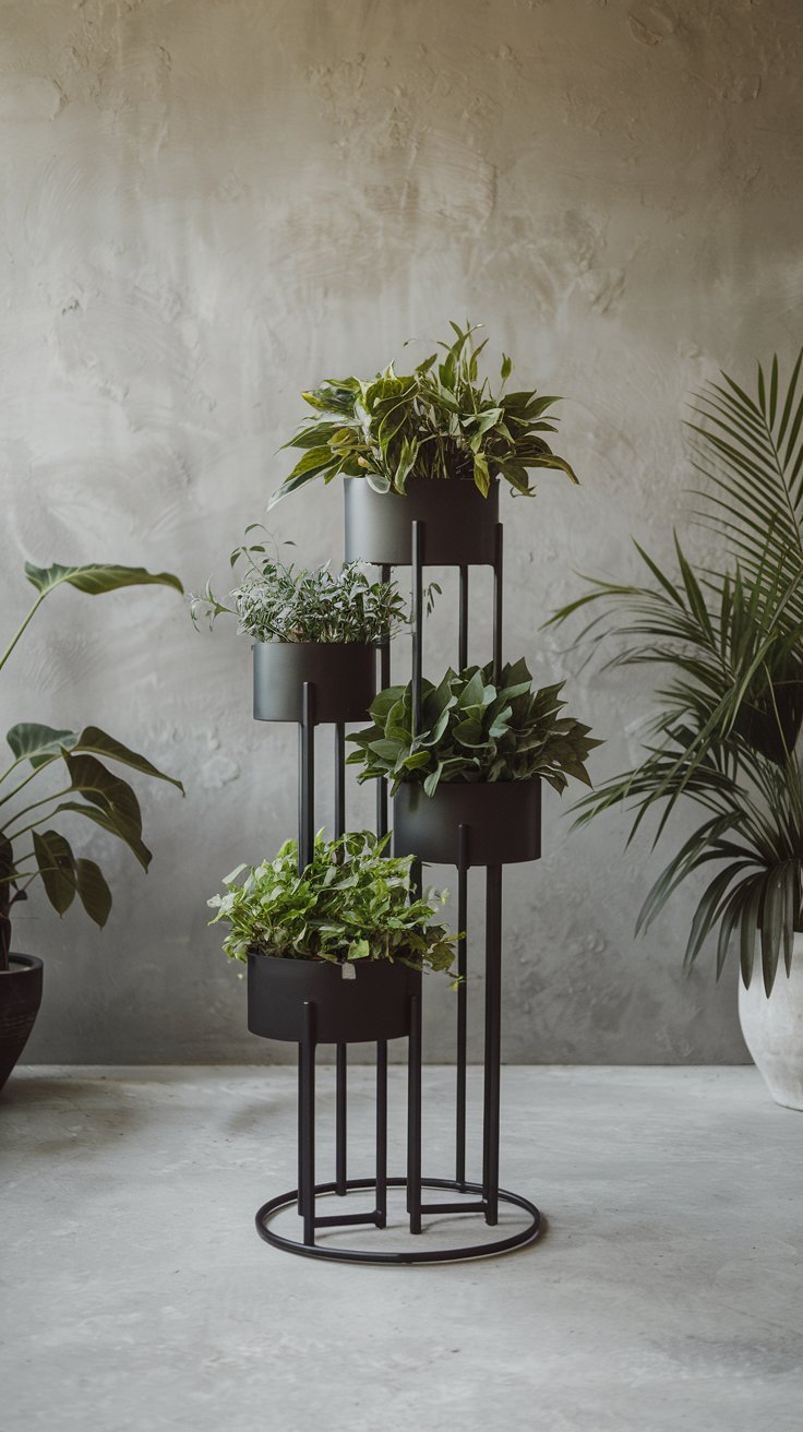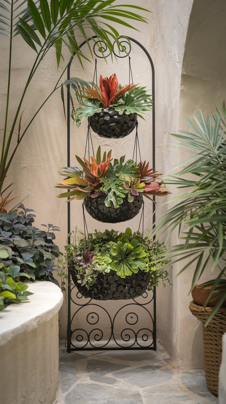 Transform a corner of your home into a green haven with a tiered black iron stand holding multiple hanging planters. Each level can be filled with tropical plants, creating a layered and dynamic display. By grouping plants with similar light and water needs, you can simplify maintenance while ensuring the greenery stays lush. This setup works especially well in cozy spaces, where the vertical design maximizes the impact of your indoor garden.